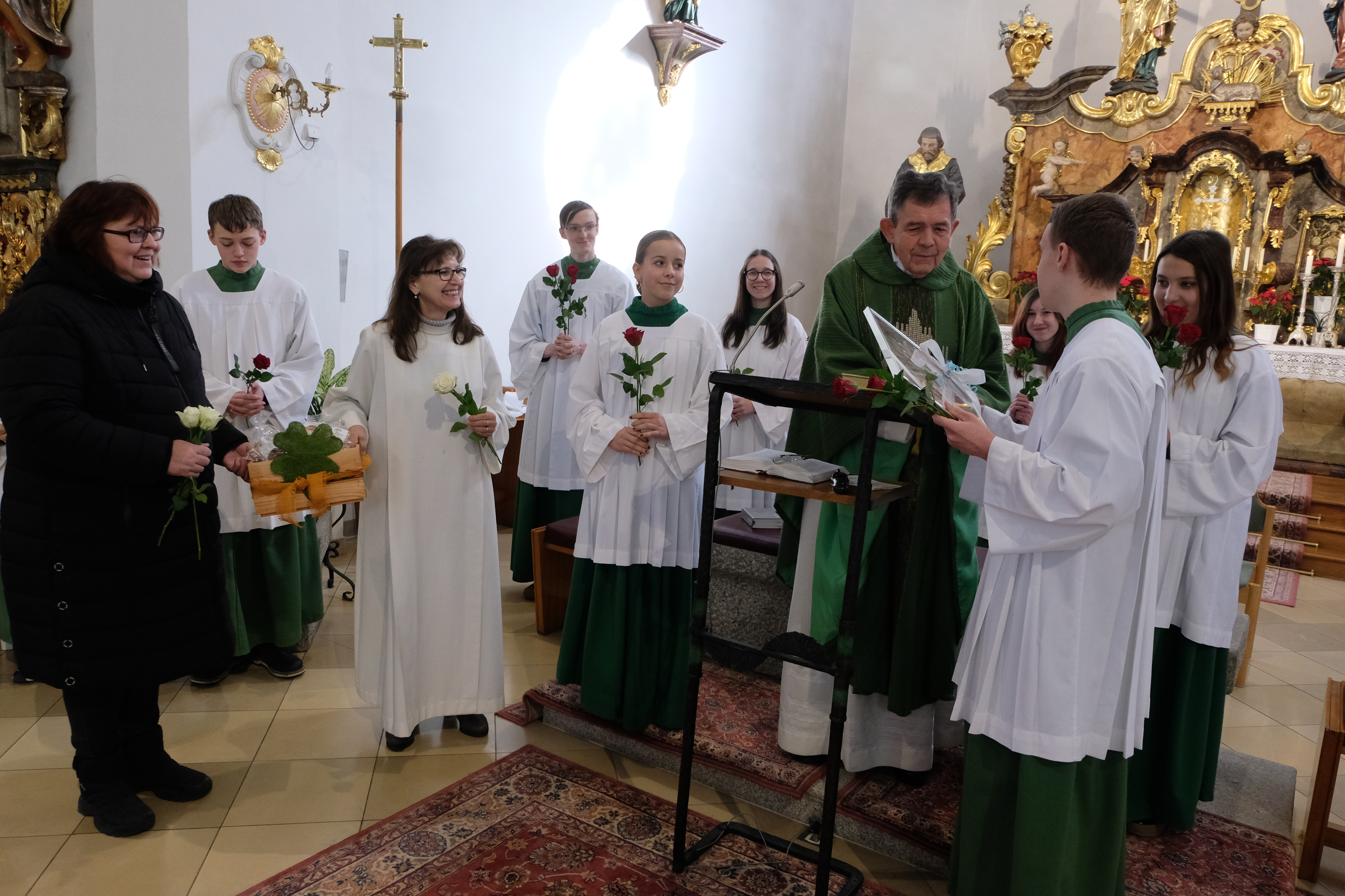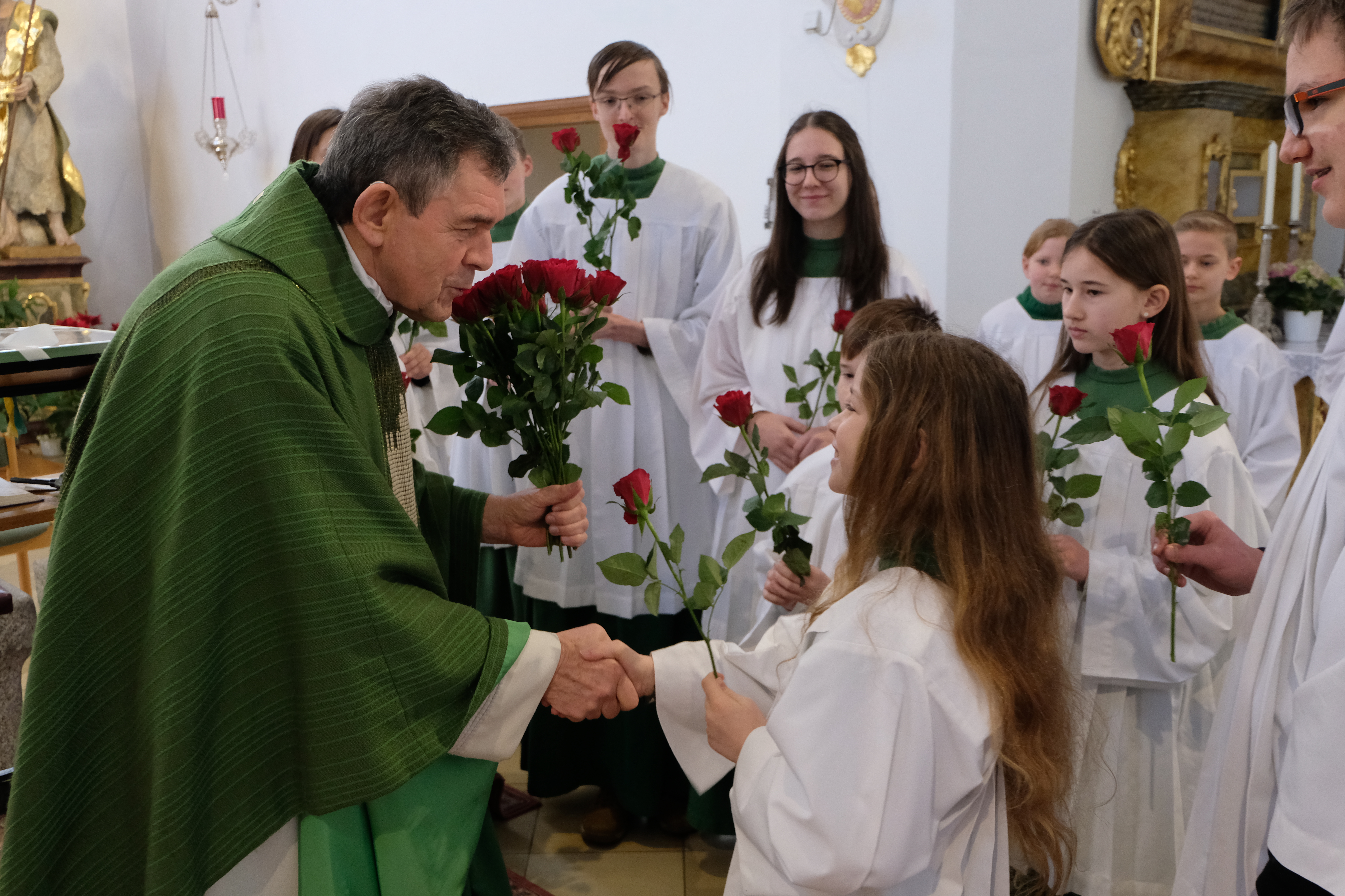 Es war der 71. Geburtstag des Priesters, der seit 1. September 2017, von Wiesau kommend, in Floß segensreich wirkt. Längst haben ihn die Gläubigen in der Pfarrgemeinde als „ihren Pfarrer“ angenommen. Sie schätzen seinen persönlichen und freundschaftlichen Umgang. Die Fülle der immer noch vor ihm liegenden Aufgaben nimmt er als seine bevorstehenden Aufgaben und Herausforderungen nicht nur an, er packt sie auch an und tut alles, um sie erfüllen zu können. Schon deshalb kennt er kein Ausspannen. Rund um die Uhr ist Pfarrer Früchtl für seine Pfarrei und seine Mitchristen als guter Hirte da. Dabei darf er immer wieder mit überaus großer Freude die Hilfsbereitschaft und Hilfe vieler fleißiger Hände, der kirchlichen Vereine und Organisationen erfahren, was er besonders zu schätzen weiß. Angetan ist Pfarrer Früchtl von der überwältigenden Spendenfreudigkeit der Gläubigen. Seine 14-tätigen Besuche und Messen im Seniorenheim „Am Reiserwinkel“ möchte er nicht missen, ebenso wie dies bei den Heimbewohnern der Fall ist. Sie mögen den persönlichen Kontakt des Pfarrers, der jedem das „Du“ anbietet. Die Eucharistiefeier am Sonntag hatte eine besondere Note. Organistin Klara Bäumler stimmte eingangs in das Lied: „Komm Herr, freu dich mit uns“ ein. Der Altar war mit der goldenen Zahl „71“ geschmückt. Ministranten – jeder mit einer Rose -, Mesner, Kirchenpflegerin, Kirchenverwaltung und Pfarrgemeinderat machten nach dem Gottesdienst ihre Aufwartung. Für sie alle sprach Elisabeth Lehner im Namen der Kirchengemeinde ihre Glück- und Segenswünsche mit einem Präsent aus, während die Gläubigen in das Lied: „Viel Glück und viel Segen“ einstimmten. Der sichtlich überraschte, freudig strahlende und dankbare Jubilar wusste auch auf seine Art ganz herzlich für diese gelungene Überraschung zu danken. Im Schlusslied sangen die Gläubigen:“ Gib uns Frieden jeden Tag“.