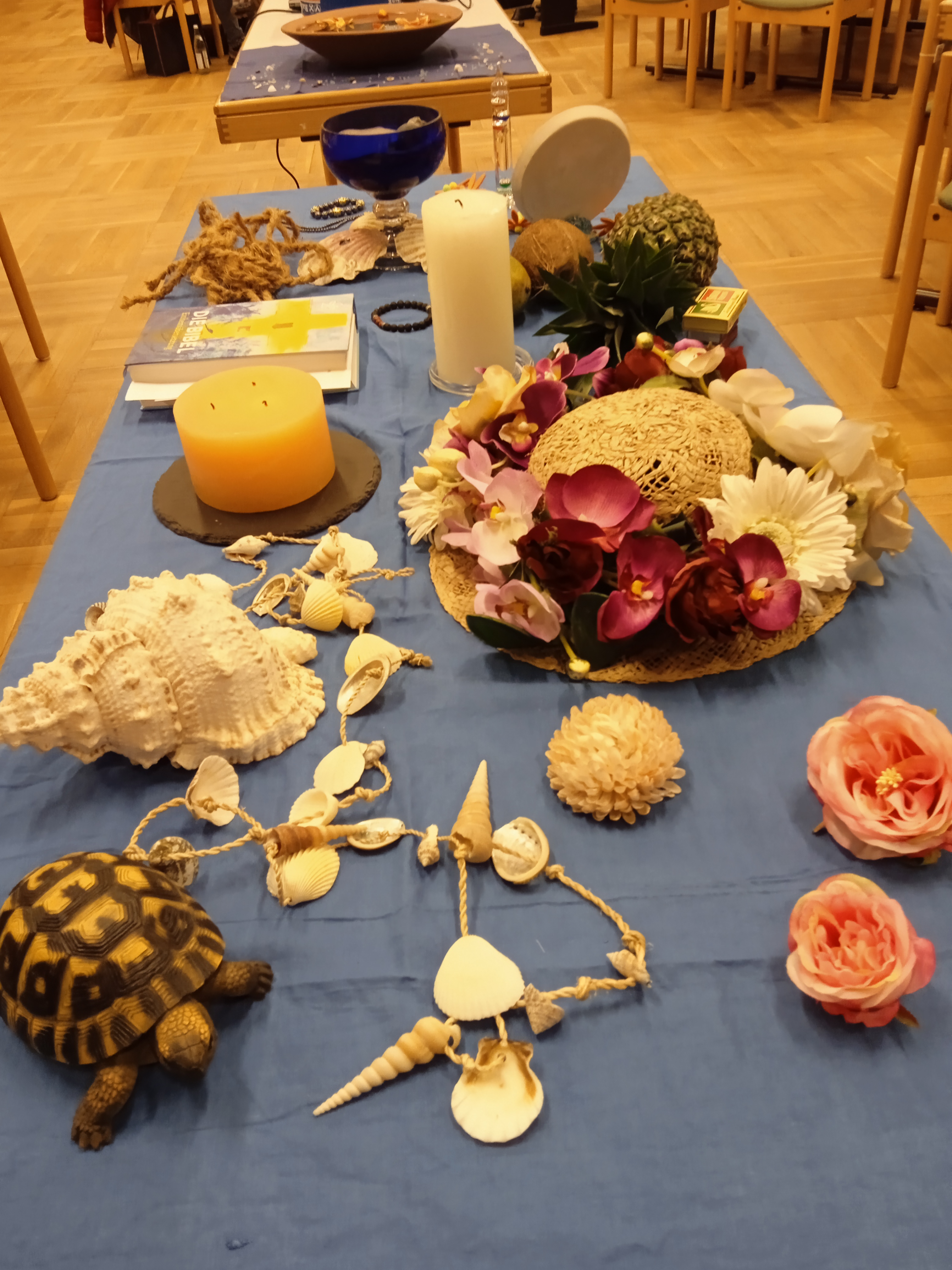 Auch die Dekoration war sehr ansprechend: der Tisch wurde liebevoll mit Bibel, Kerzen, Südfrüchten, Muscheln, Blumen und einer Schildkröte geschmückt.  Ein wunderschönes Fischernetz mit exotischen Meeresbewohnern bereicherte noch zusätzlich das Ambiente dieser Feier.