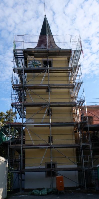 Ganz eingehüllt ist seit einigen Tagen das Kleinod des Marktes, die St. Nikolauskirche. Nachdem die Dachdecker- und Spenglerarbeiten in dieser Woche fertig gestellt werden, können jetzt die Sanierungsarbeiten am Turm der Kirche beginnen. Pfarrer Max Früchtl, ein gewissenhafter und ständiger Begleiter der Bauarbeiten, sowie der Kirchenverwaltung geht es darum, dass die Außenarbeiten noch rechtzeitig vor Wintereinbruch abgeschlossen werden können. Die Sanierungsarbeiten in der Kirche selbst haben bereits mit der Dämmung der Decke begonnen.