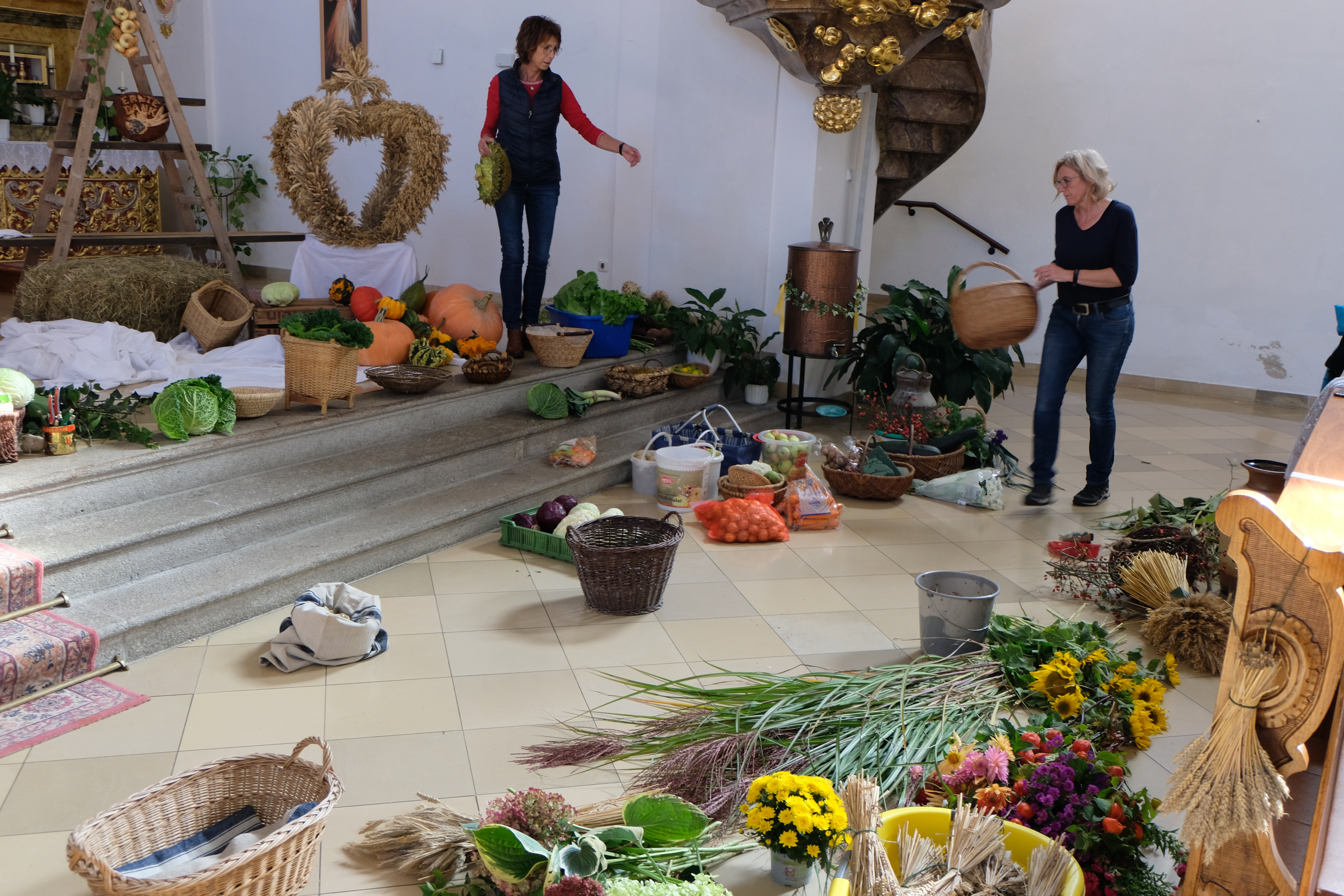 Auch im Coronajahr 2020 hatte es sich das vom Seniorenkreis um Marlene Noetzel gebildete Team zur Aufgabe gemacht, sich um den Erntealtar in der Pfarrkirche zu kümmern. Und dieses beispielhafte Engagement wurde   in diesem Jahr fortgesetzt. Und das alles in Eigenregie von Marlene Noetzel mit Ehemann Gerhard, Tochter Katharina und Schwester Karin Rast. Auch Vroni Bauer half mit.