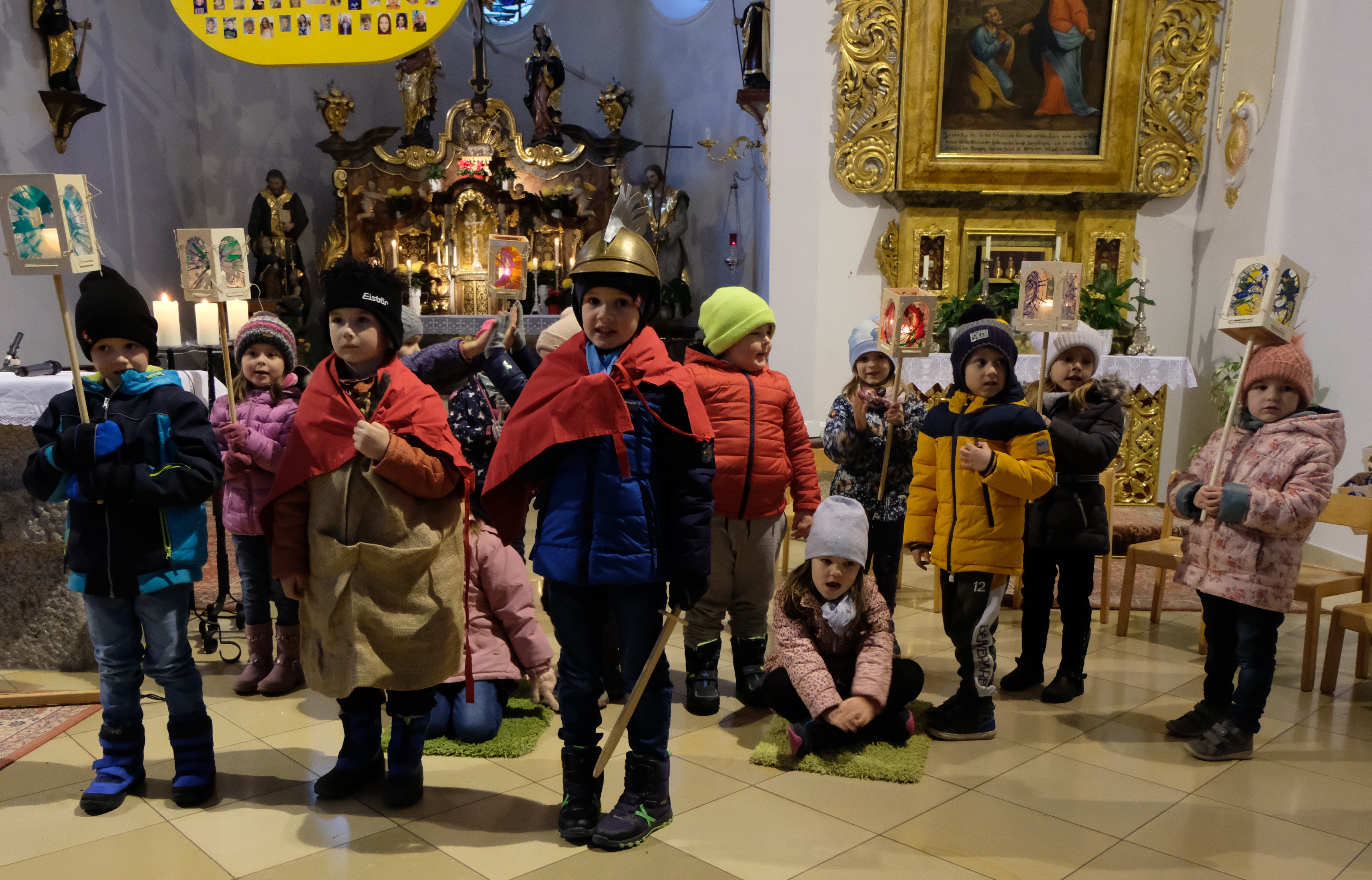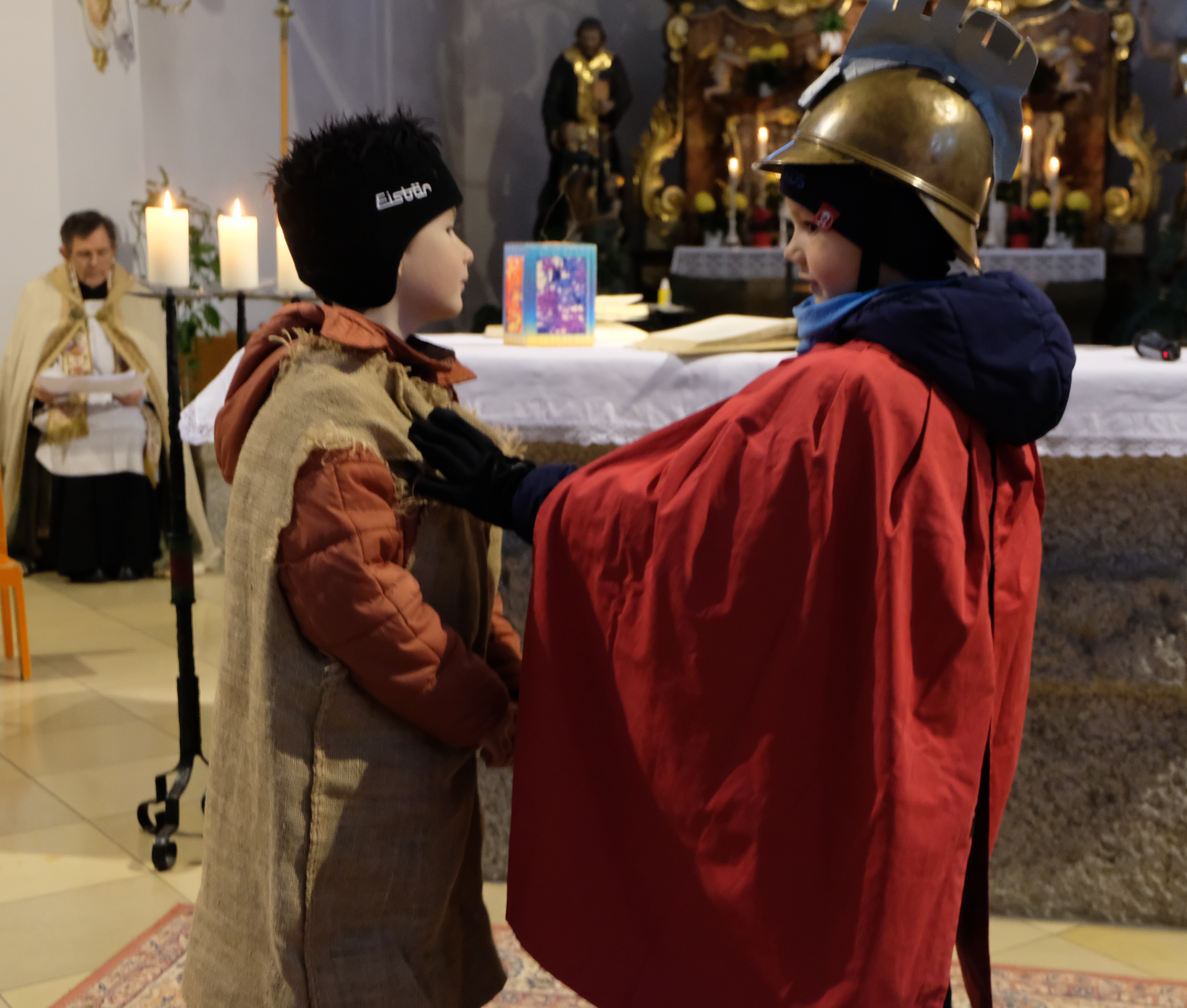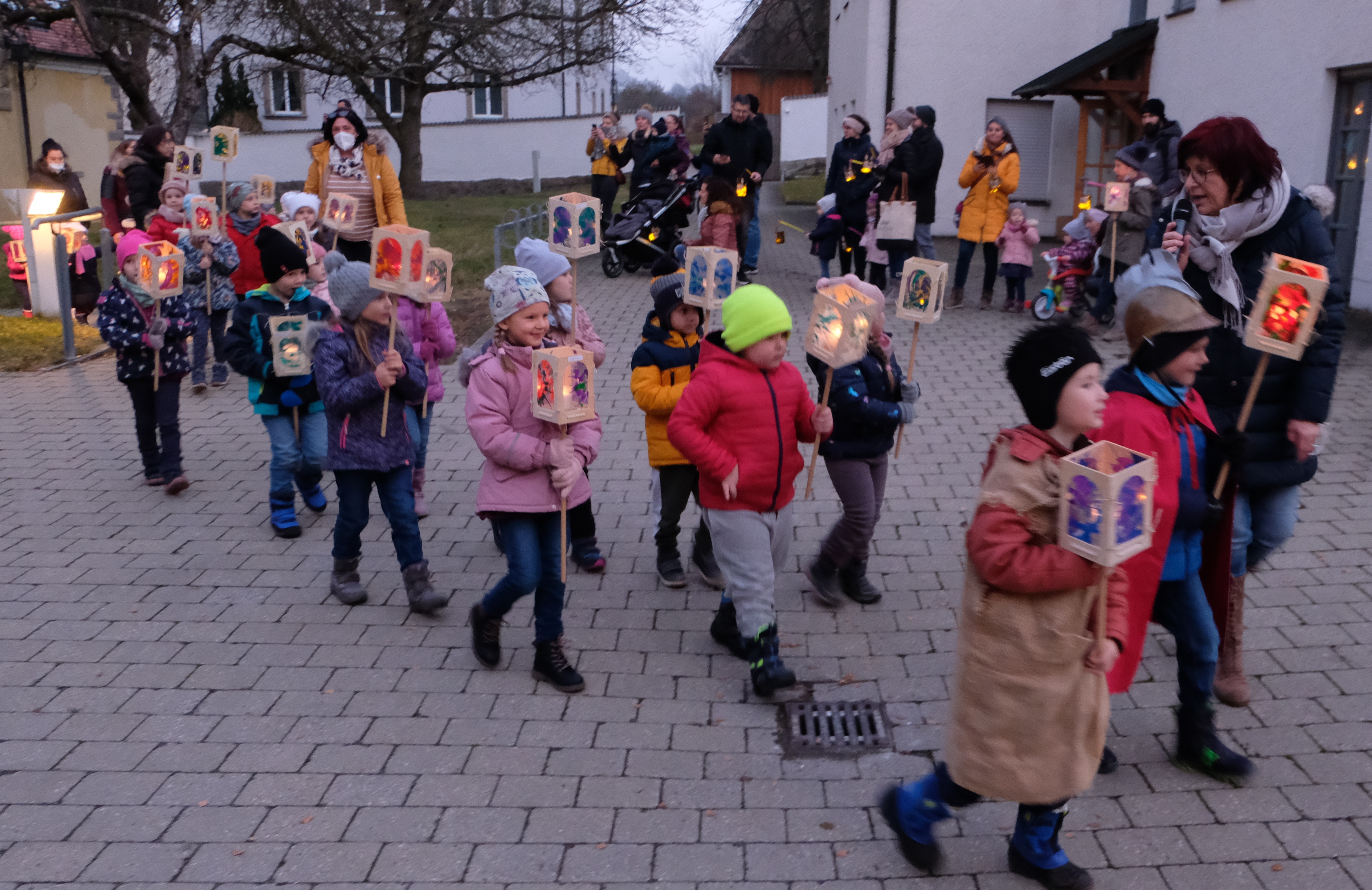 Für die Kinder der Kindertagesstätte St. Johannes Maria Vianney war es eine riesige Freude und ein unvergessliches Erlebnis, was sie am Freitag in der Pfarrkirche St. Johannes der Täufer und beim Umzug um das Pfarrzentrum mit ihren hellen Lichtern erfahren durften. Schon der singende Einzug „Laterne, Laterne, Sonne, Mond und Sterne“ in das dunkle Gotteshaus mit Pfarrer Max Früchtl, Leiter/Erzieher Sebastian Reil und seinem Team, war eindrucksvoll. In seiner Begrüßung sagte Sebastian Reil, dass die Kinder mit ihren Laternen Licht und Hoffnung in die Dunkelheit der Welt hineintragen. Das kam auch mit dem Lied „Wir tragen ein Licht in die Welt hinaus“ zum Ausdruck. Im Martinsspiel wurde der Mantel mit dem Armen geteilt.
