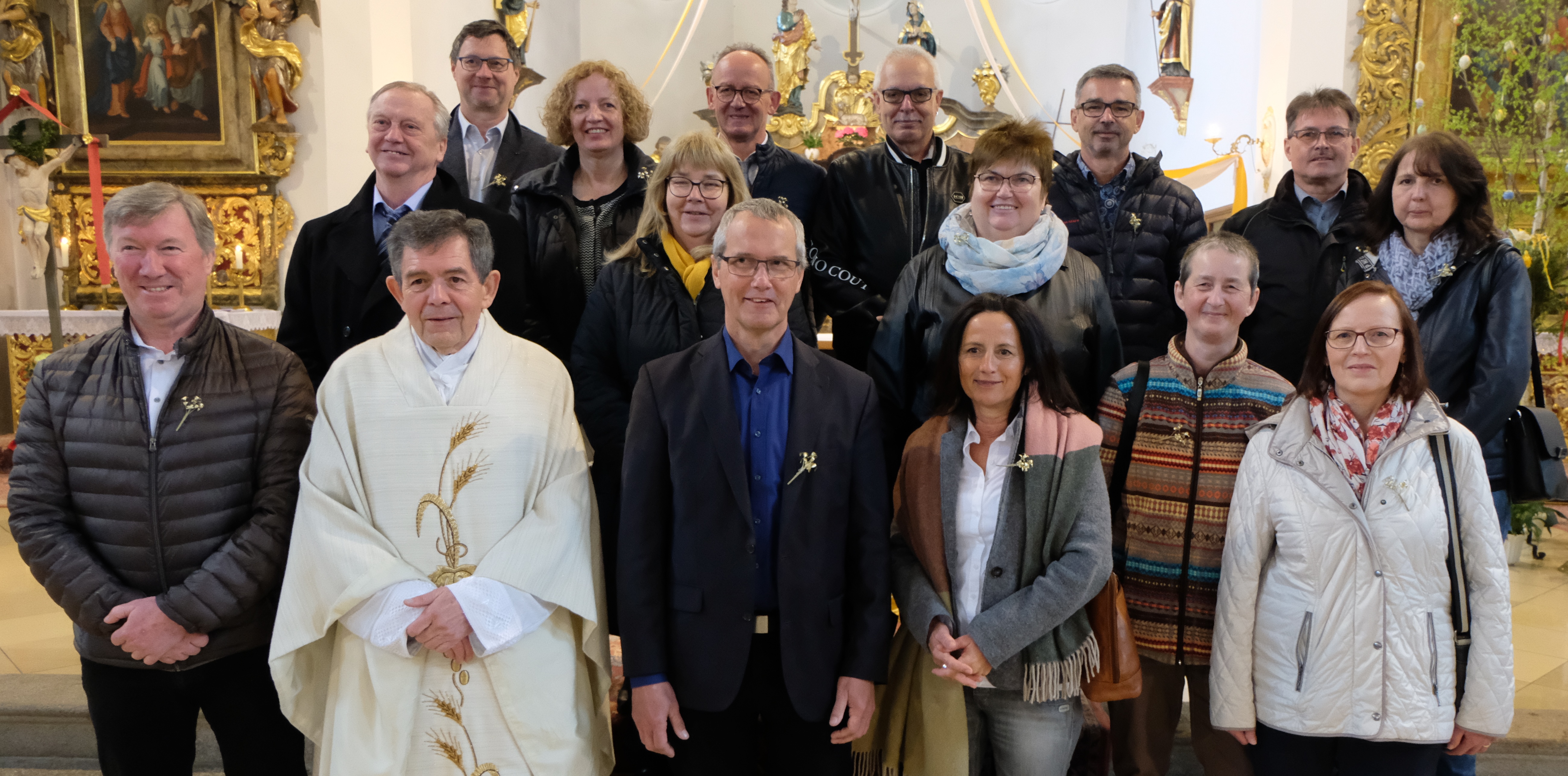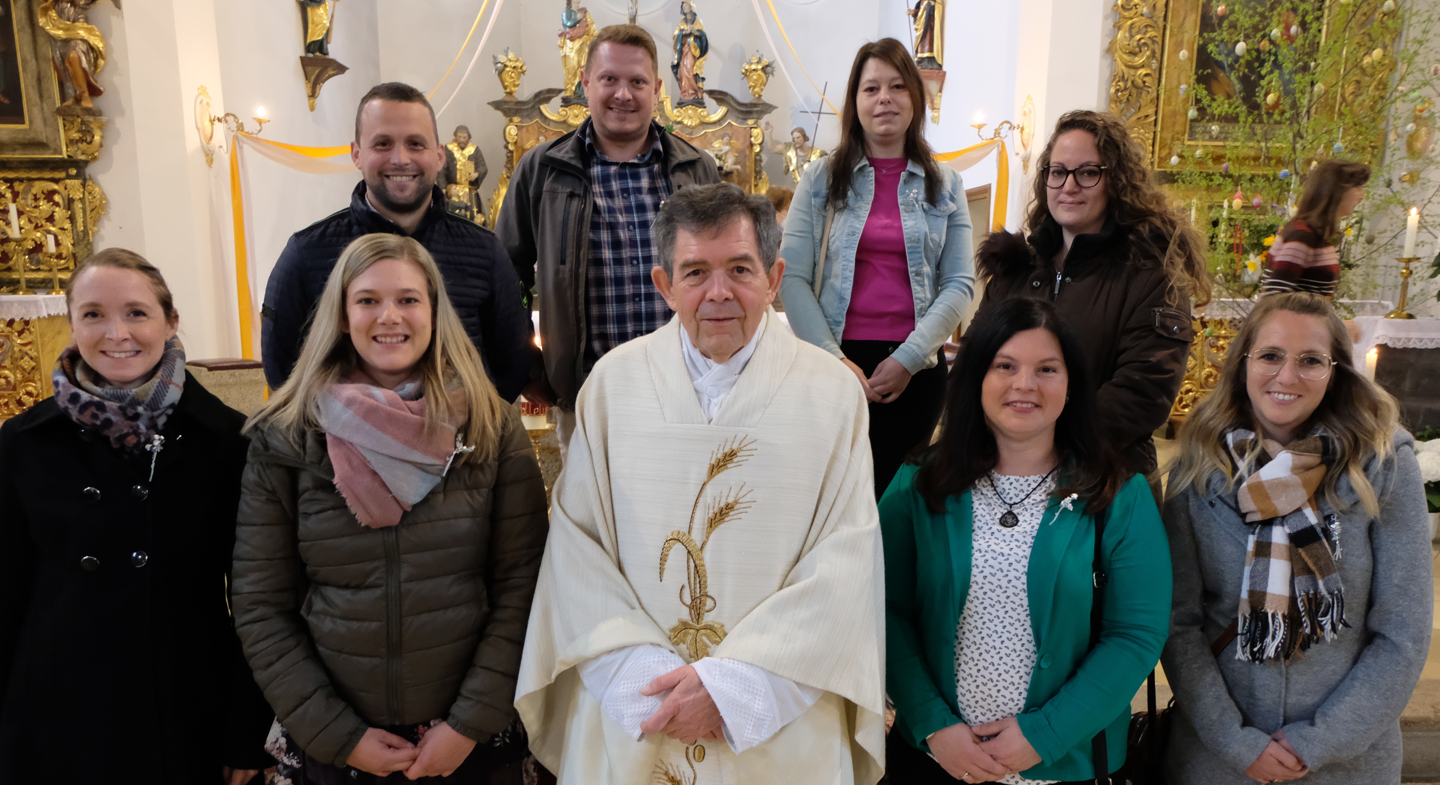 Pfarrer Max Früchtl drückte bereits im Pfarrbrief seine Freude darüber aus, dass es unter den Jubilaren einen so festen Zusammenhalt gibt. Beim ersten Wiedersehen im Pfarrer-Jakob-Raß-Zentrum am Pfarrheim St. Josef war immer wieder das „Hallo, schön, dass wir uns wiedersehen“ zu hören. Feierlich der Einzug unter Glockengeläut in die festlich geschmückte Heimatkirche. Ministranten, Kommunionhelferin Elisabeth Lehner und Pfarrer Früchtl zogen mit den Jubilaren ein. Einen festlichen Rahmen erhielt die Eucharistie durch die gesangliche und musikalische Gestaltung des Flosser Jugendchores unter Leitung von Florian Schieder. Dass dieses Mitfeiern in der Eucharistie Kraft, Halt und Stärke fürs Leben und für den Glauben an Jesus Christus geben möge, diese Hoffnung drückte der Pfarrer in seiner Predigt aus. Erstaunt hatte der Pfarrer durch Schilderung von Ereignissen und Erinnerungen in den vergangenen Jahrzehnten. Es werde wahre Kommune, die Gemeinschaft gepflegt und das sei gerade in der heutigen Zeit nötiger denn je. Der Geistliche warf die Frage auf, was die Menschen ohne Gott, ohne Religion wären. Die Jubilare bat er, weiterhin Zeugen was Christus heißt zu sein. Die Fürbitten trugen Jubilare vor. Höhepunkt war der Empfang der Heiligen Kommunion. Unter den Jubelkommunikanten befand sich auch Bürgermeister a. D. Fred Lehner, der vor 80 Jahren erstmals an den Tisch den Herrn trat. Zum Abschluss des Gottesdienstes und dem Segen des Pfarrers sang der Chor: „Lobe den Herren meine Seele“. Die goldenen Jubilare gedachten vor dem Gottesdienst im Friedhof aller verstorbenen fünf Schulkameraden sowie Lehrern und Erziehern.