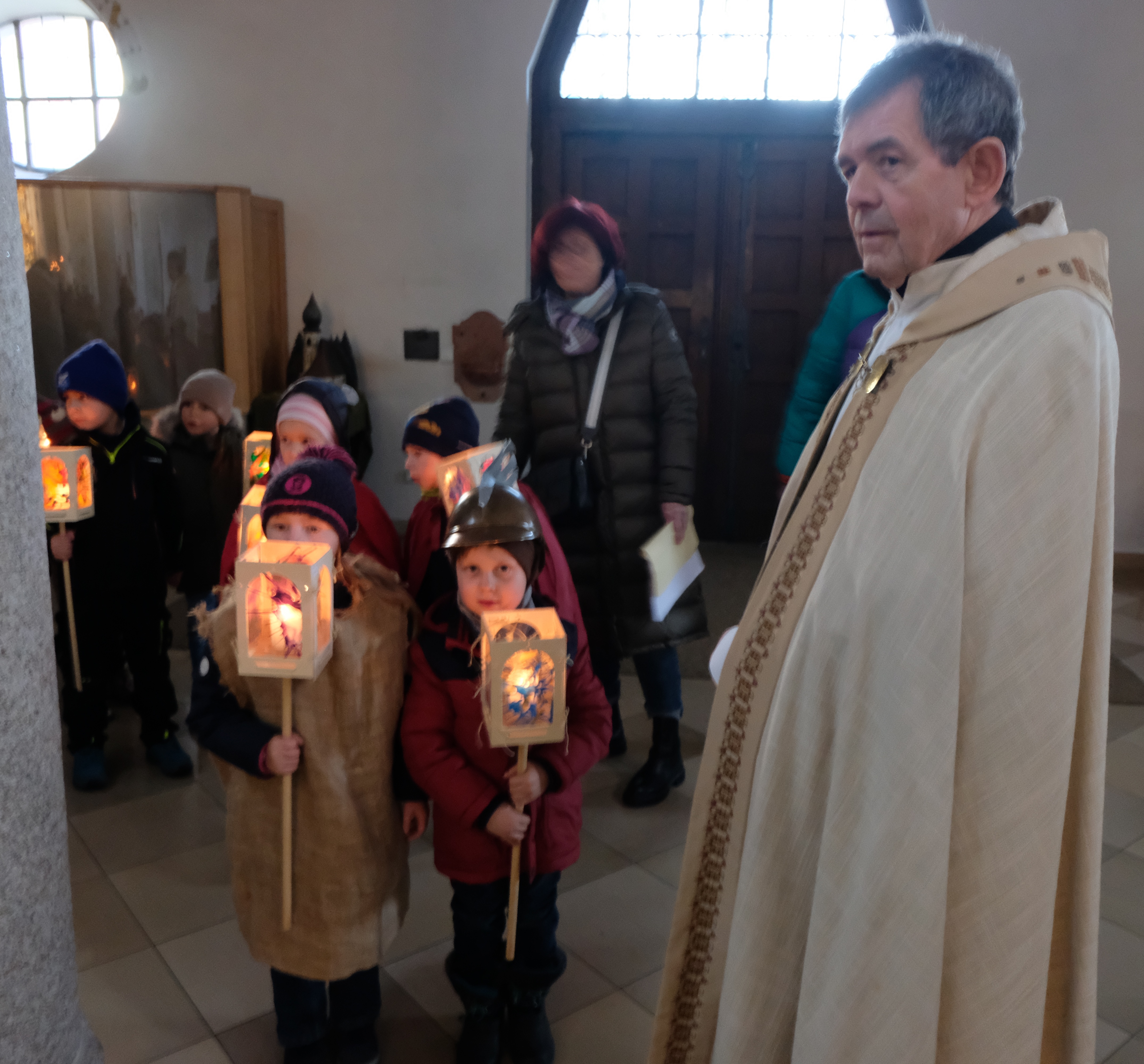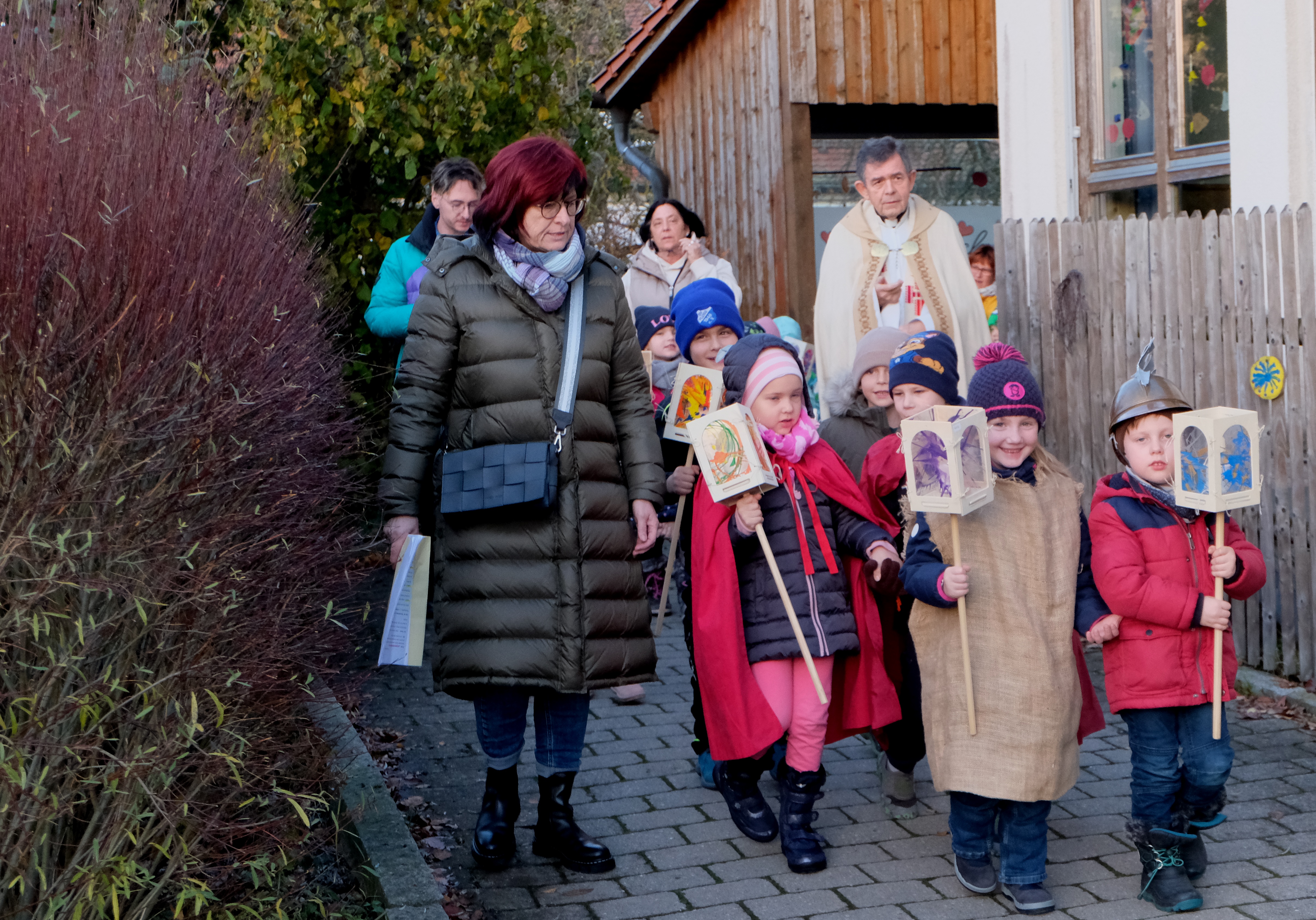 Vom Kindergarten durch das Pfarrer-Jakob-Raß-Zentrum in die Pfarrkirche St. Johannes der Täufer zogen die Kleinen des katholischen Kindergartens mit ihren hellen Lichtern. Mit Freude sangen sie: „Ich geh mit meiner Laterne“. Das dunkle Gotteshaus war für die Kinder etwas ganz Besonderes. Pfarrer Max Früchtl, Erzieher Sebastian Reil und das Kindergartenteam begleiteten die kleinen Christen. „Die Laternen bringen Licht und Hoffnung in die doch so finstere Welt“, sagte Pfarrer Früchtl bei seiner Begrüßung zu Beginn der feierlichen Andacht. Lieder, Spiele, Gebete, das Vater unser und der Segen des Pfarrers beendeten die Andacht. Der anschließende mit Lichtern erhellte Martinszug um den Nexans-Großparkplatz ins Pfarrzentrum zurück war von den Besuchern dicht umsäumt. Die Kinder bildeten einen großen Singkreis und erfreuten mit weiteren Liedern, die von Sebastian Reil (Gitarre) begleitet wurden die Besucher. Der Kinder-Elternbeirat hatte sich bestens vorbereitet und verteilte Martinshörnchen als Lohn und Dank für die Teilnahme.