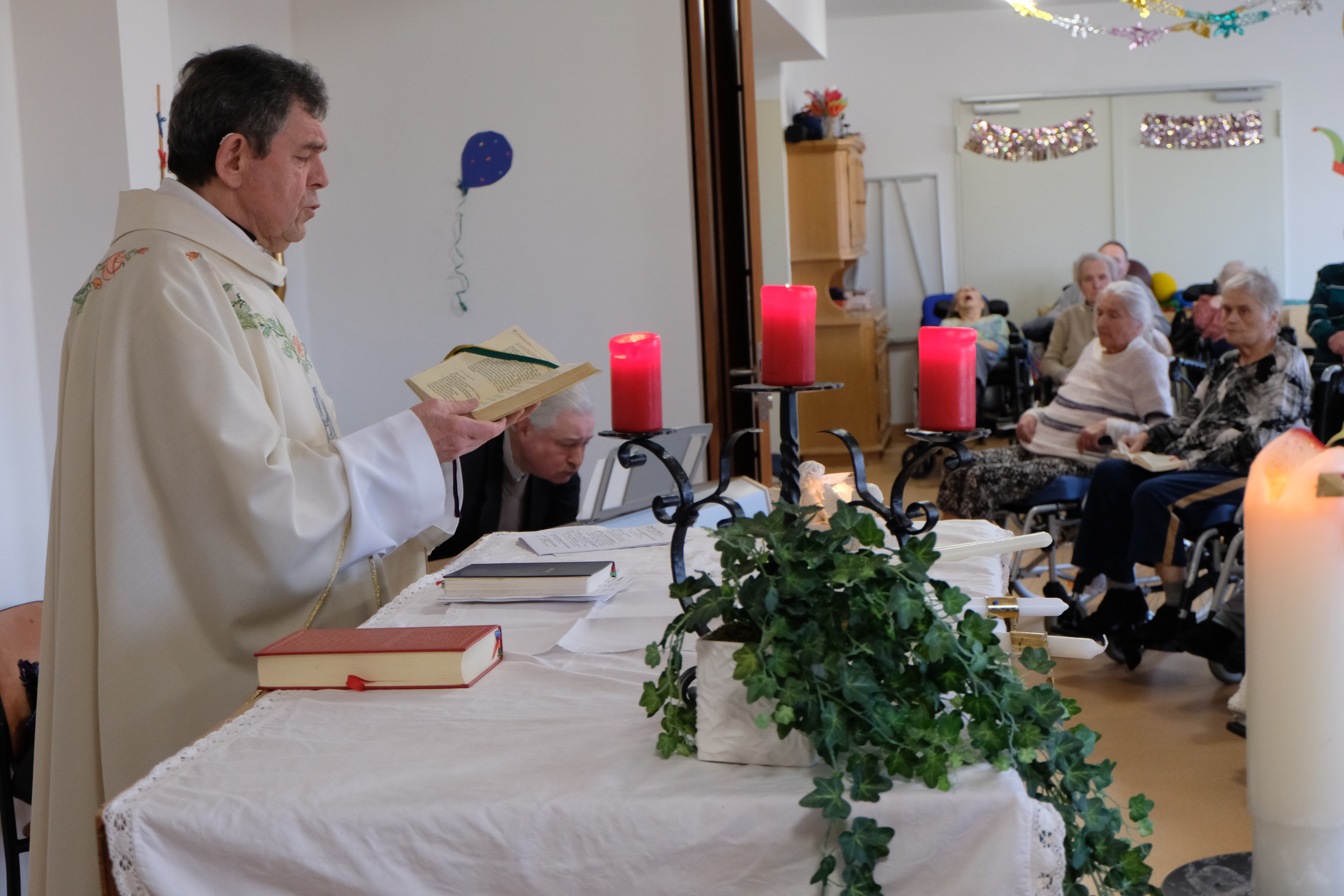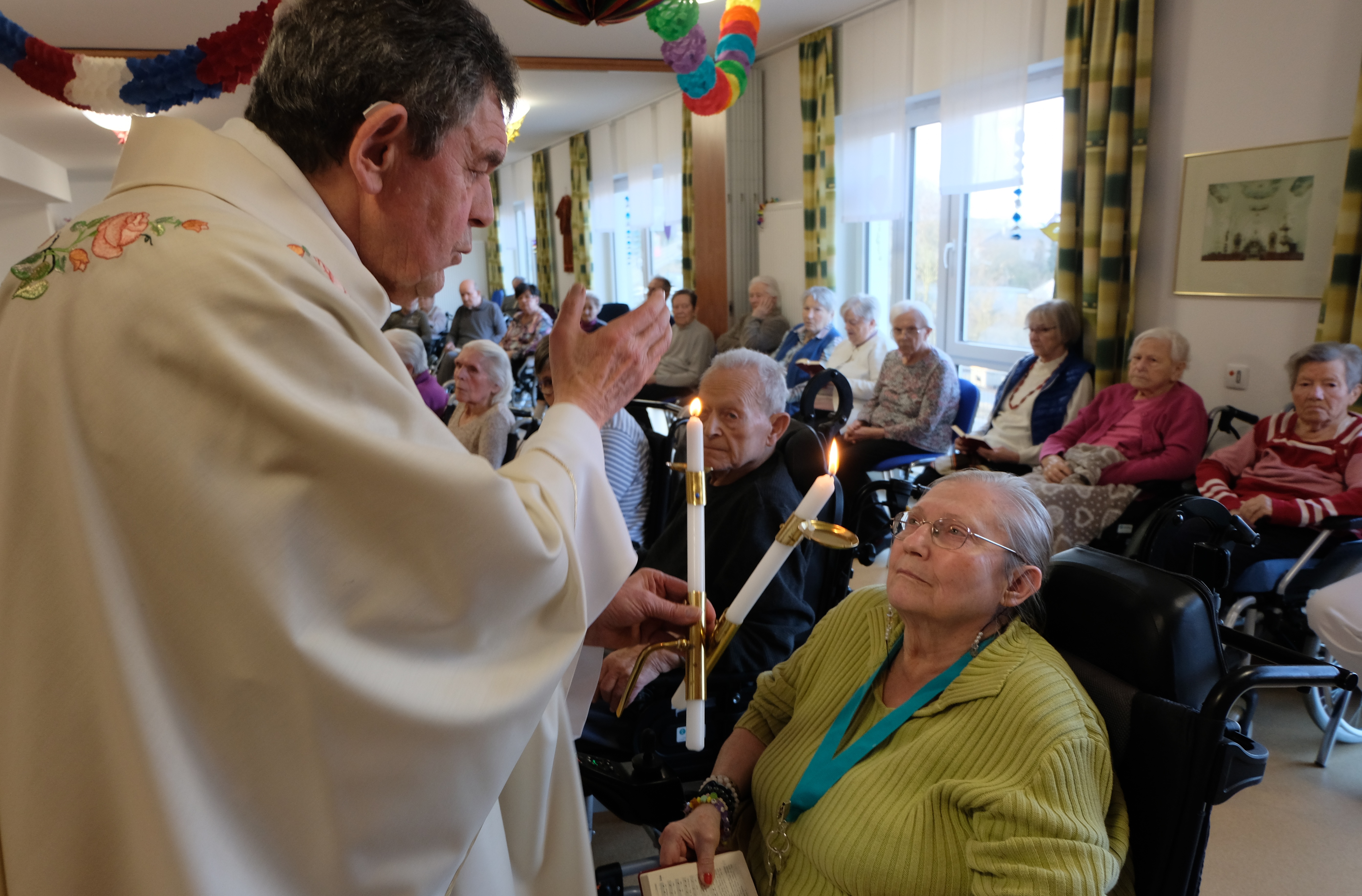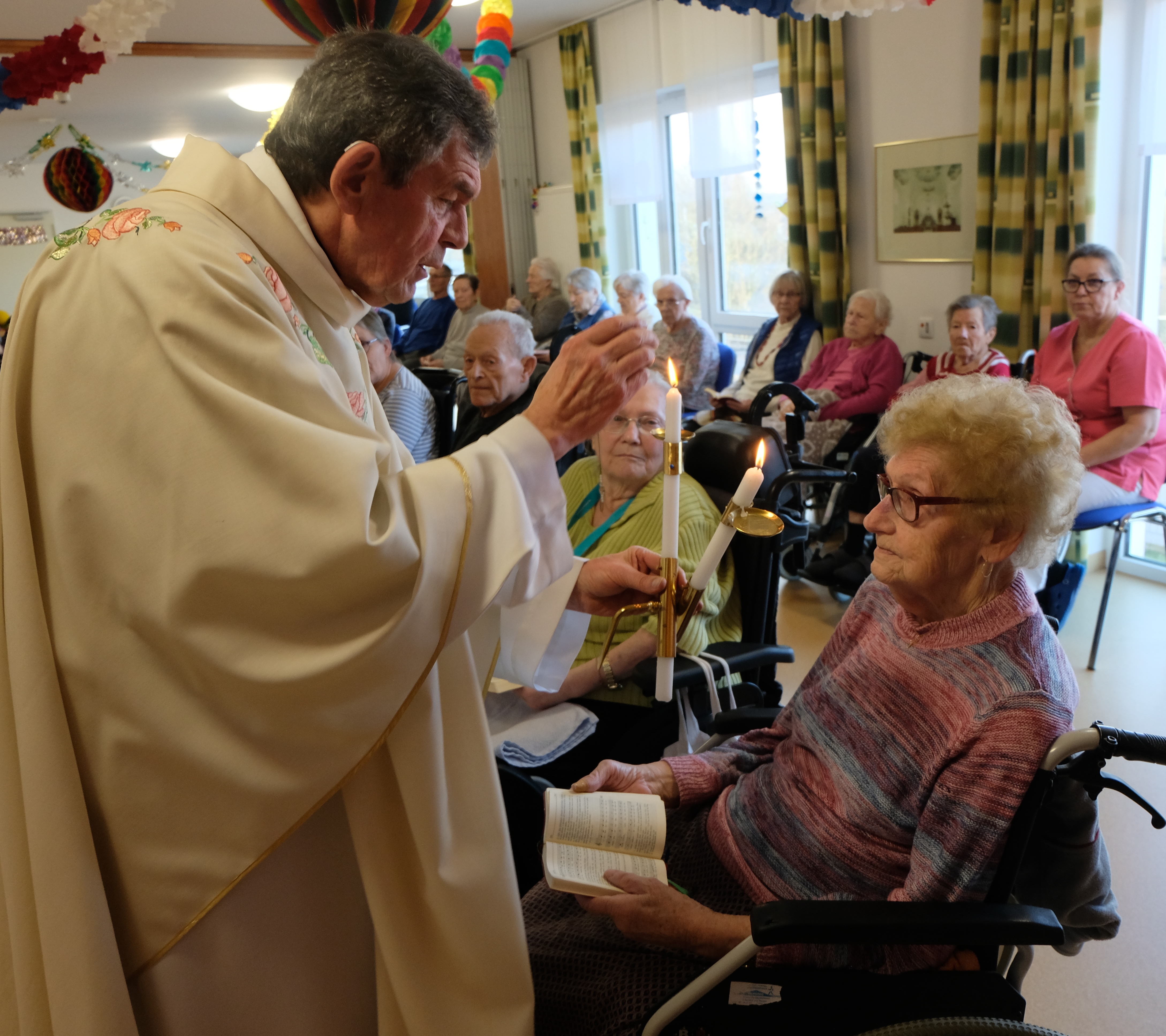 Pfarrer Max Früchtl spendet Blasius-Segen im Seniorenheim