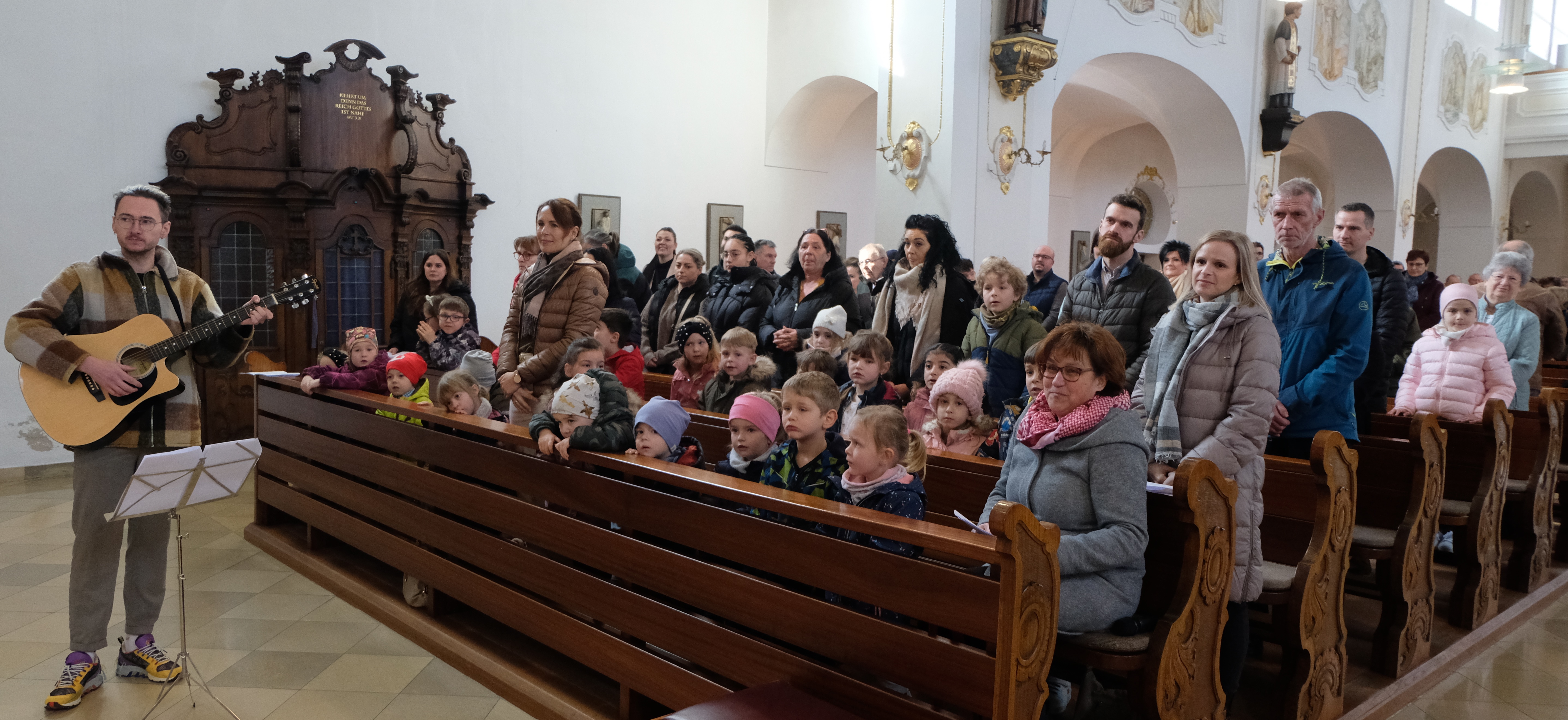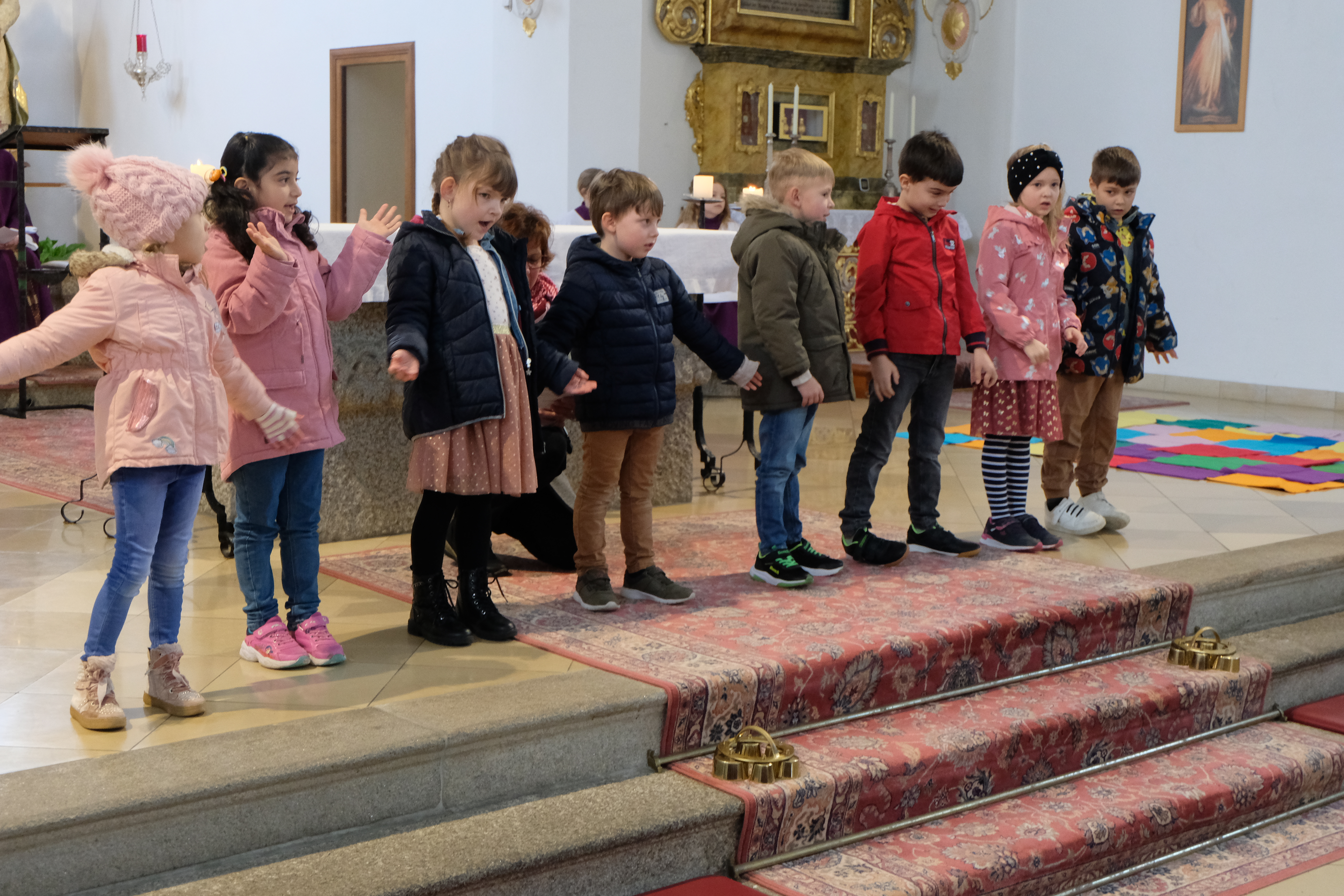 Es hat sich seit Jahren gut eingeführt, dass der fünfte Passionssonntag in der katholischen Pfarrgemeinde St. Johannes der Täufer ganz im Zeichen der Familien steht. Pfarrer Max Früchtl legt darauf großen Wert. Den von ihm zelebrierten Gottesdienst gestalteten die Kleinen und Kleinsten der Kindertagesstätte St. Johannes Maria Vianney mit Leiter Sebastian Reil und seinem Team. Mit ihren frisch gesungenen Liedern und Vorträgen, begleitet von Sebastian Reil mit seiner Gitarre, erfreuten sie die dankbaren Gläubigen. Außerdem hat das Team vom Eine-Welt-Laden erneut Waren angeboten. Noch besser könnte der Zuspruch sein.