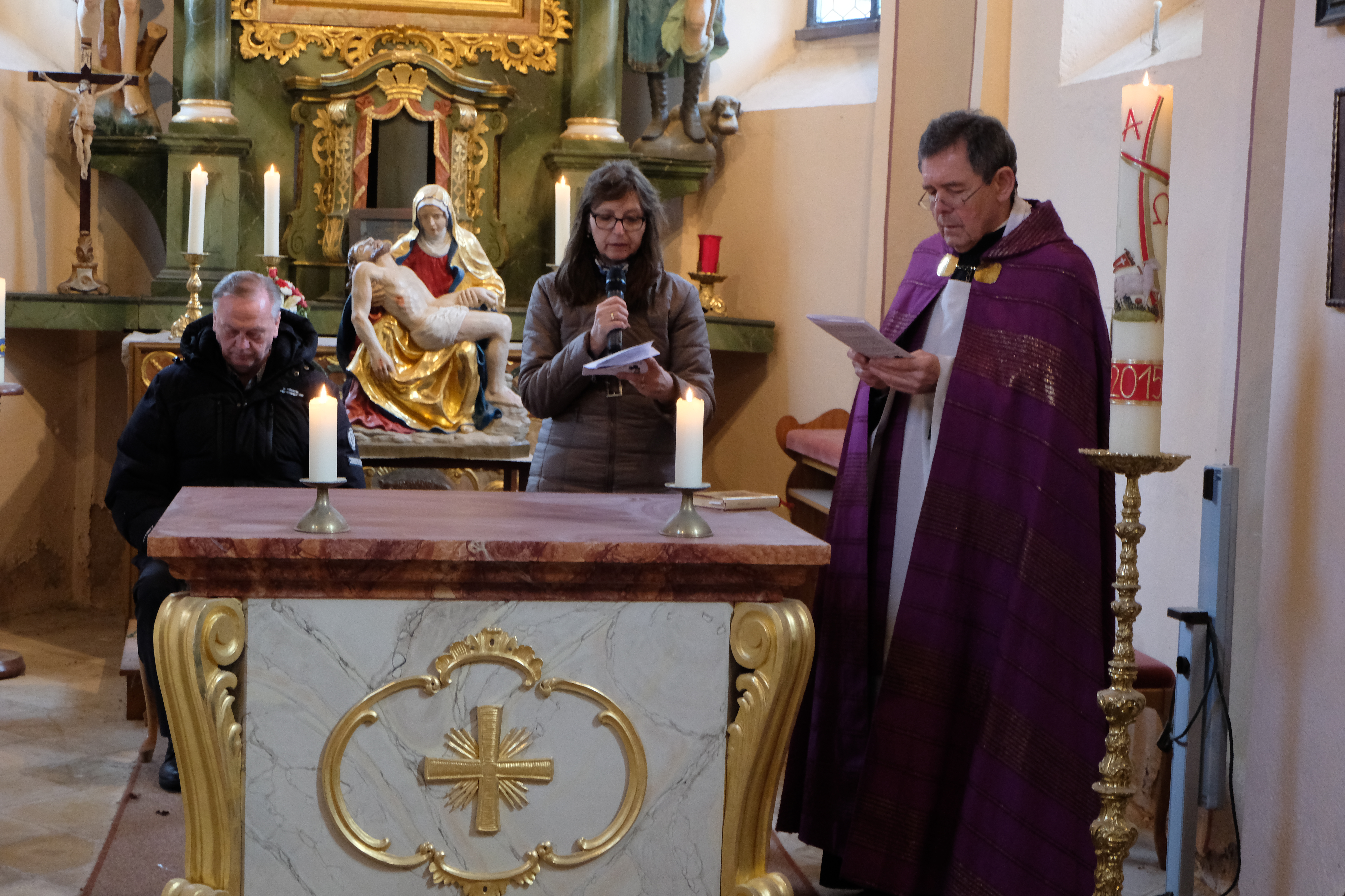 Am Nachmittag wurde auf dem St. Nikolausberg abgehalten. Die schlechten Witterungsverhältnisse zwangen Pfarrer und Gläubige, erstmals wieder nach langer Bauzeit im Gotteshaus die Kreuzwegandacht zu halten. Dort sind die 14 Stationen im Bild festgehalten. Eingangs wurde am Gedenkstein gebetet. Der Kreuzweg stand unter dem Thema: „Wenn ich von der Erde erhöht bin, werde ich alle an mich ziehen“ von Werner Eizinger. Im Gebet zum Abschluss wird Gott gebeten, uns jeden Tag neu seinen Heiligen Geist, der uns einführt in die volle Wahrheit und der uns stärkt auf dem Weg deiner Nachfolge zu senden.