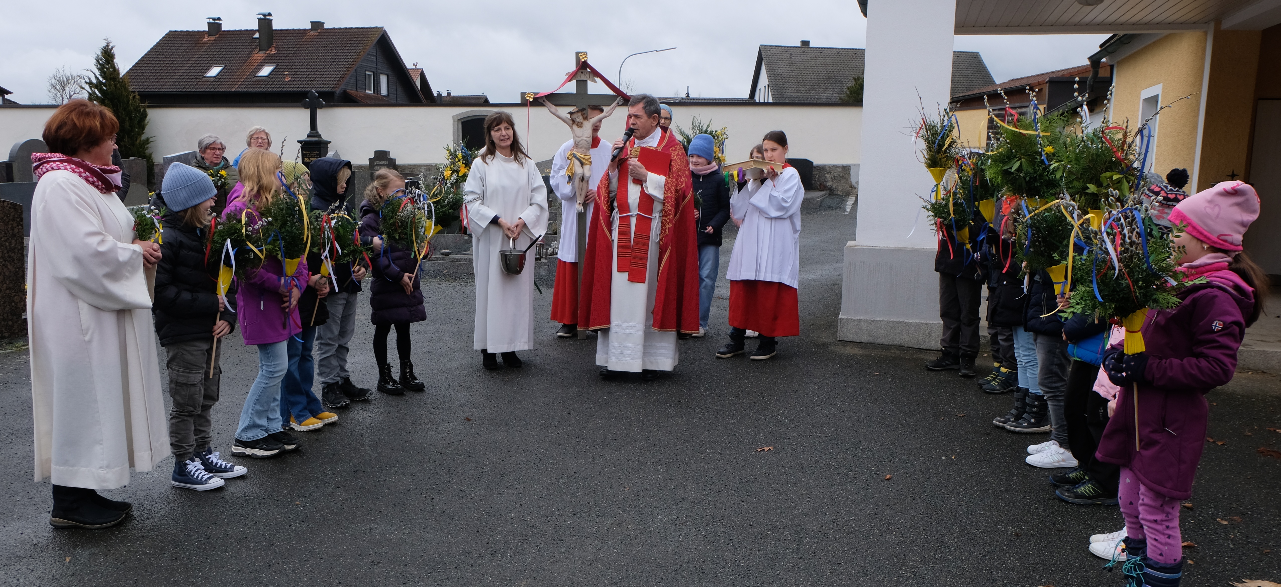 Am Friedhofeingang trafen sich die Gläubigen mit Pfarrer Max Früchtl und zogen nach der Segnung der Palmbuschen und Verkündigung des Evangeliums ins Heiligtum der Pfarrkirche ein. Dort wurde ein Gottesdienst mit der Leidensgeschichte, anschließend die Eucharistie gefeiert. Eindrucksvoll die großen Palmbuschen der Kinder. Die vom Frauenbund gebundenen Sträucher wurden an die Gläubigen verkauft. Der Erlös geht an Schwester Ellen in Südafrika für aidskranke Kinder.