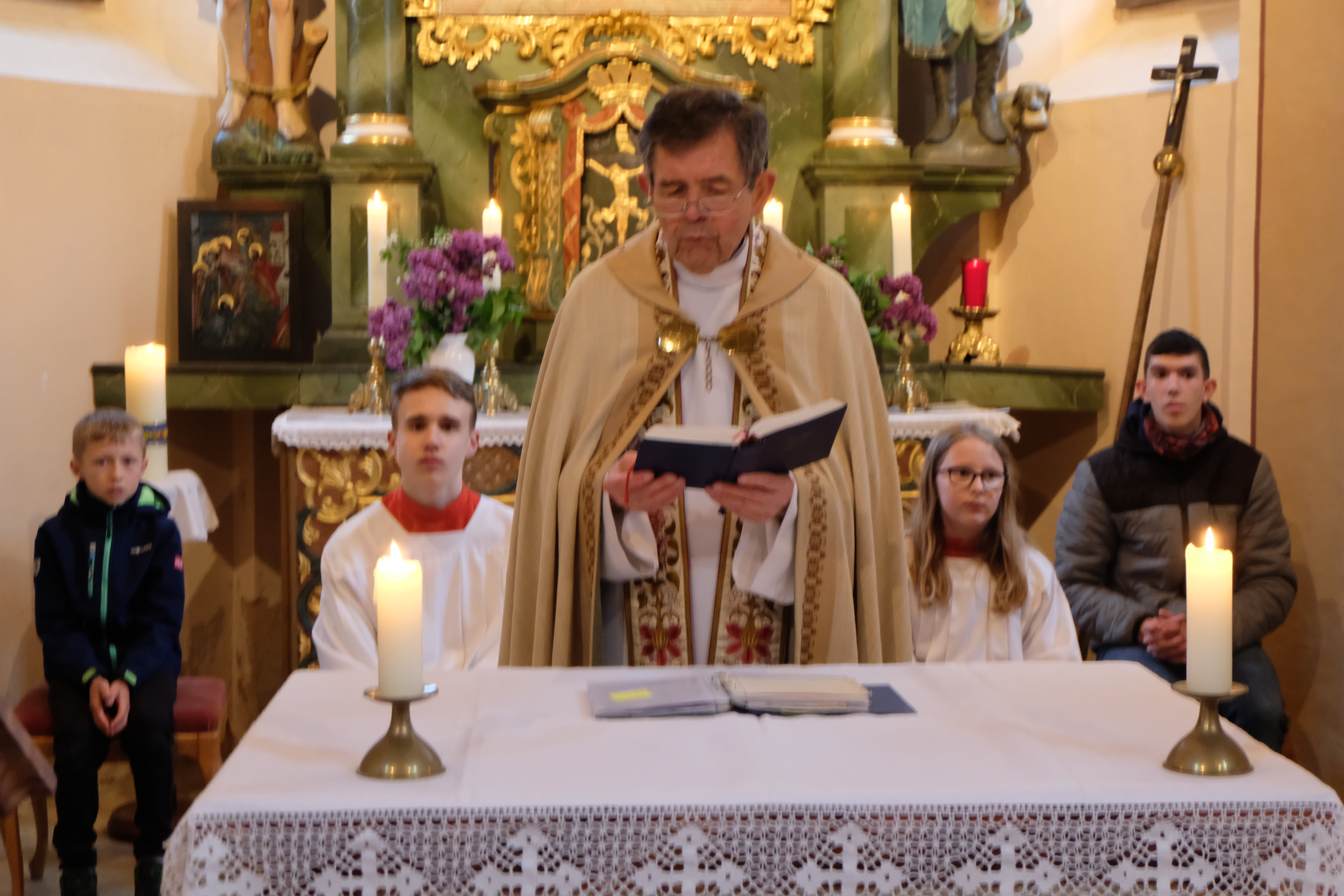 Das Mesnerehepaar Elisabeth und Herbert Riedel sowie Roswitha Bergmann sorgten für einen reichen und hellen Kerzenschmuck im Altarraum, am Altartisch sowie am Seitenaltar und der Statue der schmerzhaften Mutter Gottes mit dem Jesuskind. Nach der Segnung mit Weihrauch ließ Pfarrer Früchtl seiner Freude freien Lauf. Er sprach vom Flosser Heiligtum auf dem heiligen St. Nikolausberg, das erstmals nach langer Zeit wieder benützt werden kann. In diesen Tagen wurden die Reinigungsarbeiten abgeschlossen.