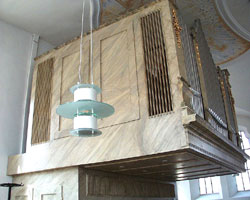 Die Orgel besteht aus 1572 Pfeifen, hat zwei Manuale, Pedal und Koppeln mit insgesamt 23 Registern. Der Orgelprospekt fügt sich harmonisch in den Raum ein. Er wurde 1997 neu gefasst. Gut zu erkennen ist der freischwebende Vorbau des Orgelgehäuses. Damit konnte für den Chor viel Platz geschaffen werden. Der zweimanualige Spieltisch ist mit mit elektrischer Spiel- und Registertraktur ausgestattet, wodurch er variabel verschoben werden kann.